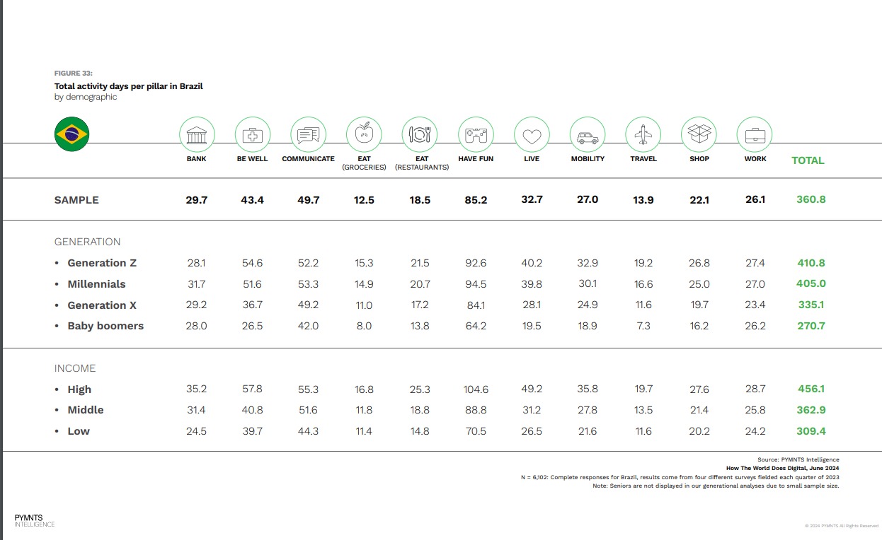 وفقًا لتقرير PYMNTS Intelligence بعنوان “كيف يتعامل العالم مع الرقمنة”، والذي شمل استطلاعًا لـ 67,000 مستهلك في 11 دولة، تصدّرت البرازيل جميع الدول الأخرى، بما فيها الولايات المتحدة، في التفاعل الرقمي. ففي عام 2023، استخدم 66.8% من البرازيليين تطبيقات البنوك عبر الهواتف المحمولة مرة واحدة شهريًا على الأقل، بينما اعتمد 46.8% عليها بشكل أسبوعي.