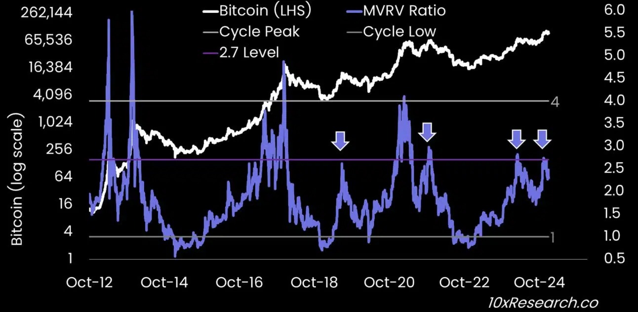 وتُظهر نسبة القيمة السوقية إلى القيمة المحققة (MVRV) أن بيتكوين تقترب من مستويات تاريخية تشجع المستثمرين الكبار على جني الأرباح، ما يرفع احتمالية حدوث تصحيح كبير.