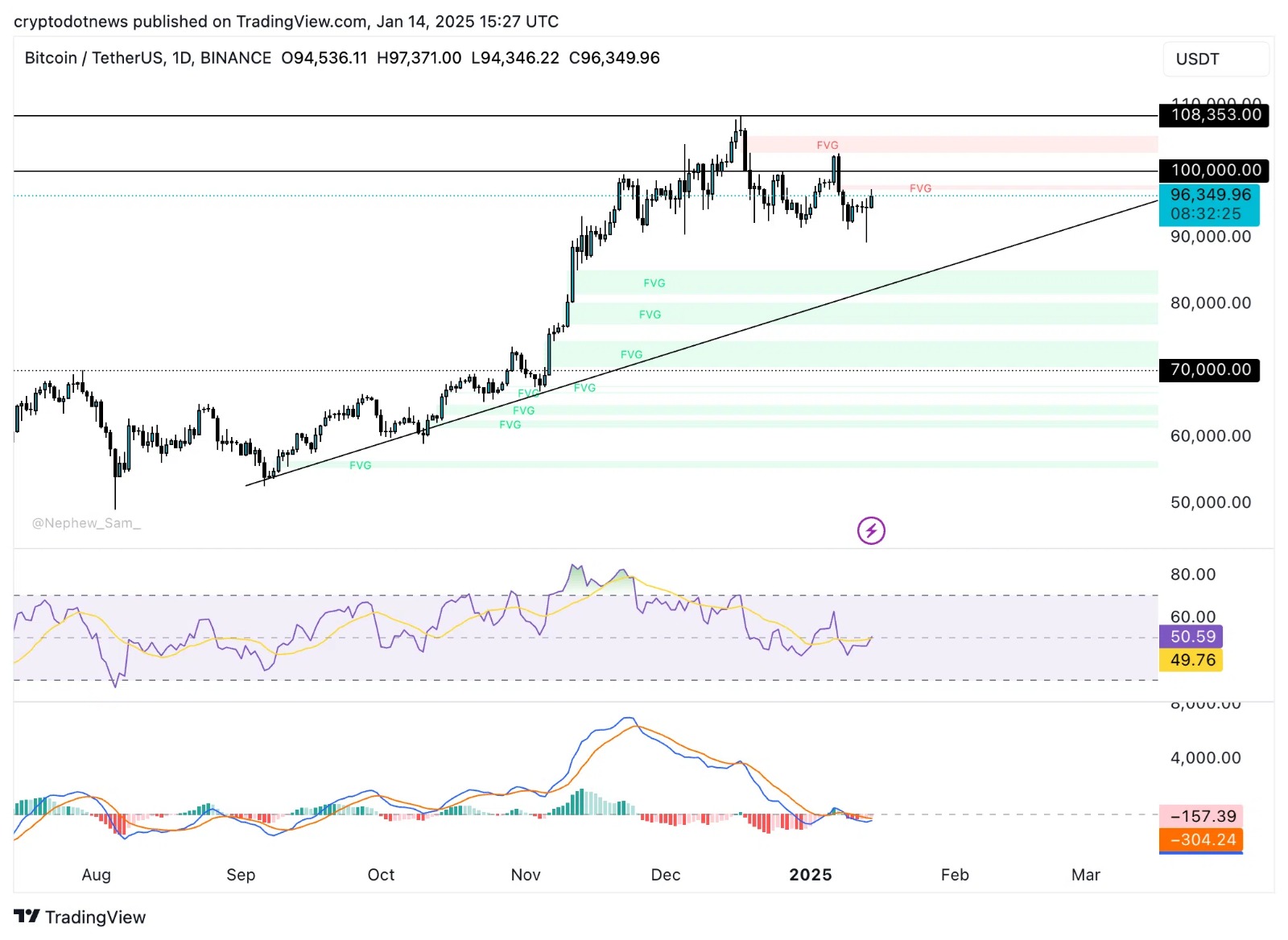 بيتكوين تتماسك حاليًا حول مستوى 96,600 دولار، وتظهر الرسوم البيانية اليومية منطقتين رئيسيتين للدعم بين 81,500 دولار و85,072 دولار، وبين 76,900 دولار و80,216 دولار.