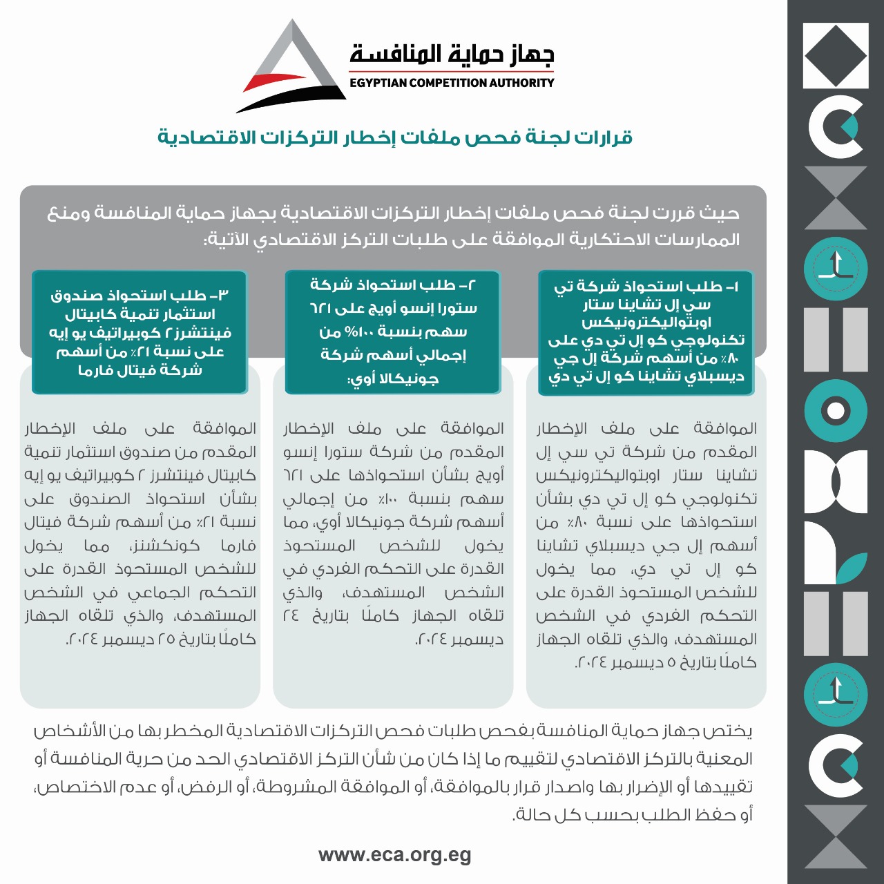 وافقت لجنة فحص ملفات إخطار التركزات الاقتصادية بجهاز حماية المنافسة ومنع الممارسات الاحتكارية على طلبات التركز الاقتصادي الآتية: