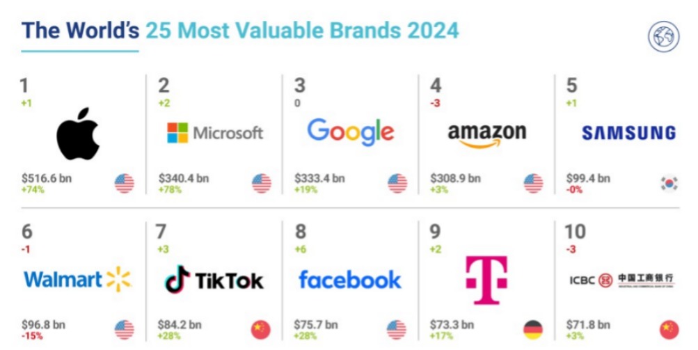 • أبل: قيمة العلامة التجارية 574.5 مليار دولار، بزيادة قدرها 11% مقارنة بعام 2024.