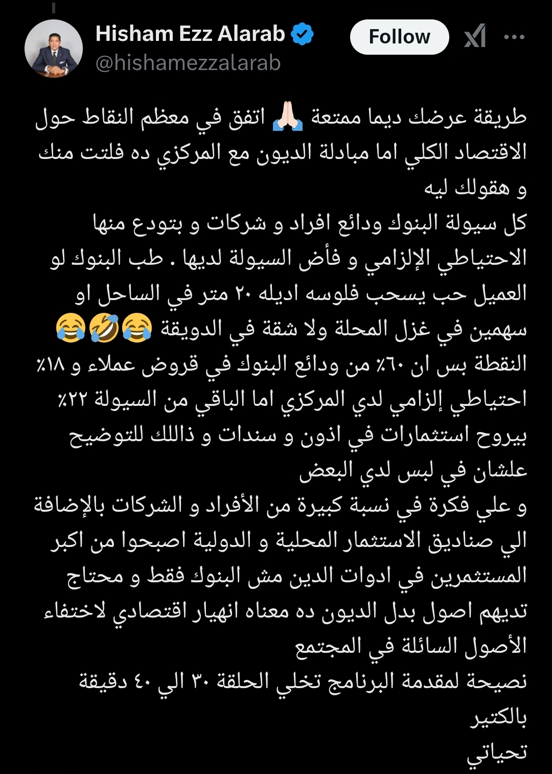 “طريقة عرضك ديما ممتعة 🙏🏻 اتفق في معظم النقاط حول الاقتصاد الكلي اما مبادلة الديون مع المركزي ده فلتت منك و هقولك ليه.