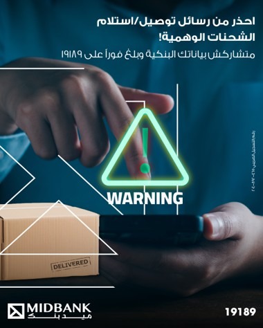 حذر ميد بنك من رسائل توصيل أو استلام الشحنات الوهمية التي قد تصل عبر الرسائل النصية، وسائل التواصل الاجتماعي، أو البريد الإلكتروني، في إطار جهوده المستمرة لحماية عملائه.