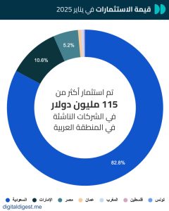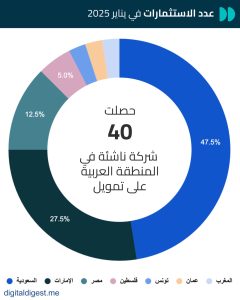 وأظهرت بيانات الموجز الرقمي، حول حجم الاستثمارات في الشركات الناشئة بالمنطقة العربية خلال يناير 2025، استحواذ السعودية على الحصة الأكبر بنسبة 82.8%، مما يعكس النمو السريع لمشهد ريادة الأعمال في المملكة وزيادة اهتمام المستثمرين بدعم الشركات الناشئة المحلية.