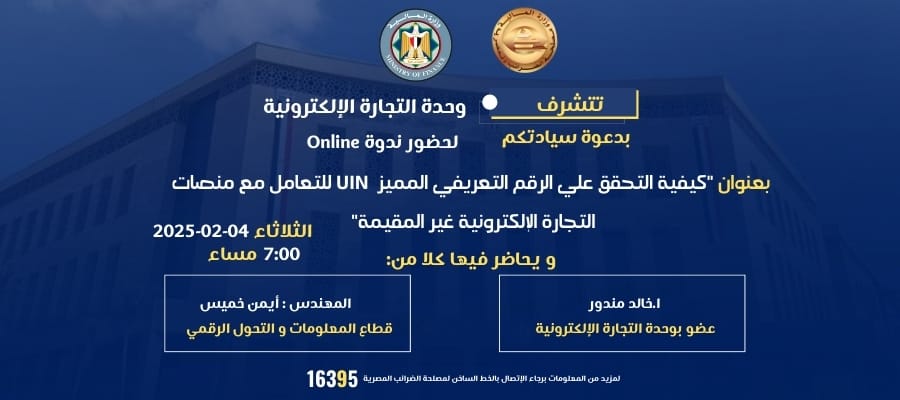تنظم وحدة التجارة الإلكترونية بمصلحة الضرائب المصرية ندوة غدًا في تمام الساعة السابعة مساءً، لمناقشة آليات التحقق من الرقم التعريفي المميز (UIN) عند التعامل مع منصات التجارة الإلكترونية غير المقيمة.