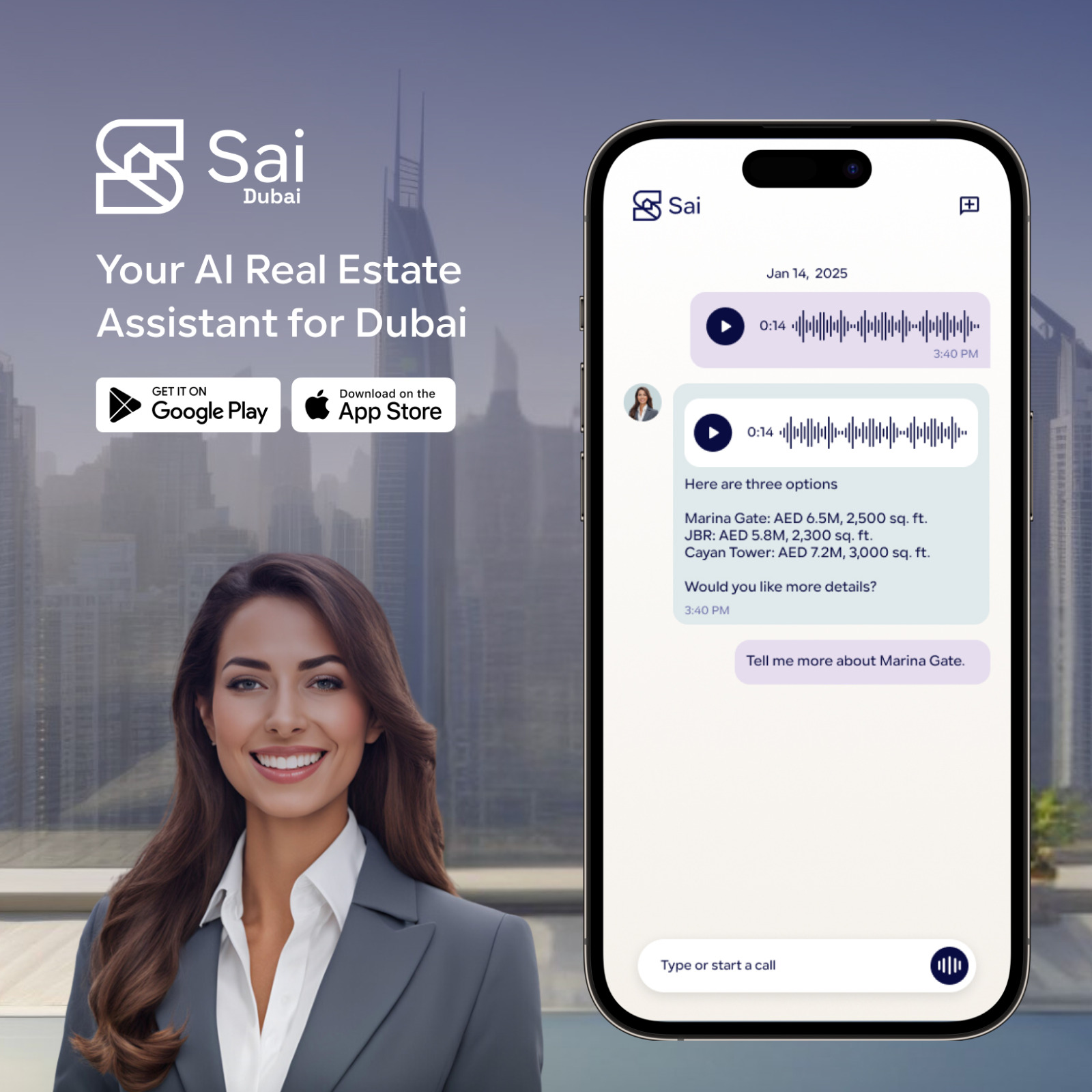 متجرا أبل ستور وجوجل بلاي: قم بتنزيل تطبيق صاي دبي على هواتف iOS أو Android لبدء استكشاف سوق العقارات في دبي بطرق مبتكرة.