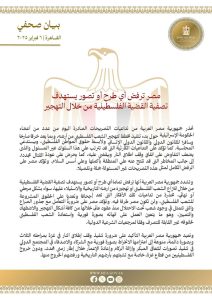 وشددت جمهورية مصر العربية على أنها ترفض تمامًا أي طرح أو تصور يستهدف تصفية القضية الفلسطينية من خلال انتزاع الشعب الفلسطيني أو تهجيره من أرضه التاريخية والاستيلاء عليها، سواء بشكل مرحلي أو نهائي، محذرة من تداعيات تلك الأفكار التي تعد إجحافًا وتعديًا على الحقوق المشروعة للشعب الفلسطيني، ولن تكون مصر طرفا فيه.