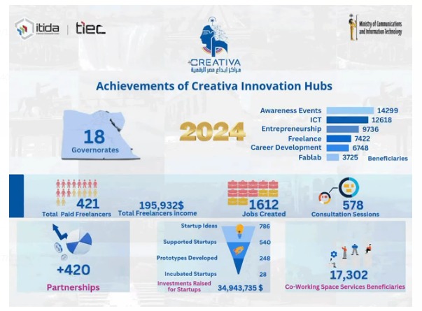 وفي إطار تعزيز الشراكات، أبرمت “كريتيفا” أكثر من 420 شراكة مع جهات محلية ودولية لدعم الابتكار وريادة الأعمال، فيما استفاد 17,302 شخص من مساحات العمل المشتركة التي توفرها. هذه الإنجازات تعكس الجهود المستمرة التي تبذلها “كريتيفا” لتحفيز الابتكار وتوفير فرص اقتصادية وتنموية للشباب المصري.