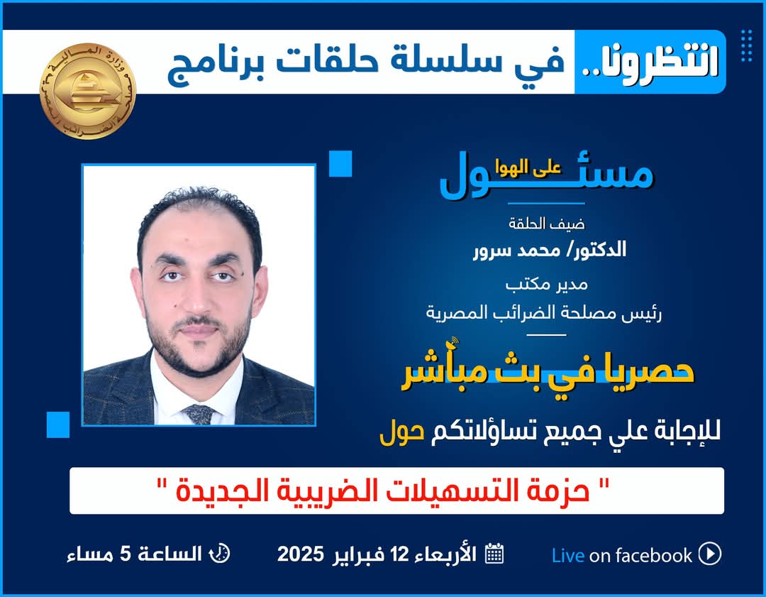 استعرض الدكتور محمد سرور، مدير مكتب رئيس مصلحة الضرائب المصرية، تفاصيل حزمة التسهيلات الضريبية الجديدة خلال مشاركته في برنامج “مسؤول على الهواء”، الذي تم بثه مباشرًا اليوم، 12 فبراير 2025، من الساعة 5:00 مساءً حتى 6:00 مساءً.