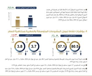 وأشار إلى أن بلغت قيمة أرصدة تمويل المشروعات المتوسطة والصغيرة ومتناهية الصغر 80.5 مليار جنيه في نهاية عام 2024 مقارنة بـ 57.1 مليار جنيه في العام السابق، بمعدل زيادة بلغت41%.