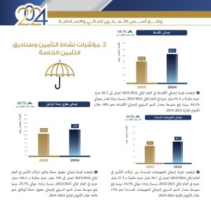 وأوضح أن قيمة فائض النشاط التأميني للشركات ارتفع ليصل إلى 14.6 مليار جنيه في 2024/2023 مقارنة بفائض بلغ 9.8 مليار جنيه في العام المالي 2023/2022 بمعدل زيادة بلغ 49.3%، بينما بلغ متوسط معدل النمو السنوي الفائض النشاط التأميني نحو 23% خلال الأعوام المالية 2023-2019.