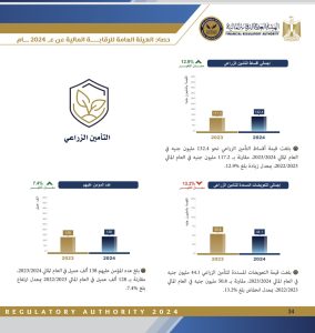 ونوه بأن قيمة أقساط التأمين الزراعي ارتفع لتبلغ نحو 132.4 مليون جنيه في 2024/2023 مقارنة بـنحو 117.2 مليون جنيه في 2023/2022 بمعدل زيادة بلغ 12.9%.