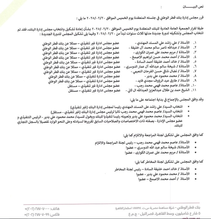 أعلن بنك قطر الوطني مصر (QNBE.CA) عن قرارات الجمعية العمومية ومجلس إدارته خلال اجتماعه المنعقد في 20 فبراير 2025، حيث تم إعادة تشكيل مجلس الإدارة لدورة جديدة تمتد حتى عام 2028، وذلك بعد إجراء الانتخابات التي أسفرت عن التشكيل التالي، رهناً بموافقة البنك المركزي المصري والجهات الرقابية المختصة:
