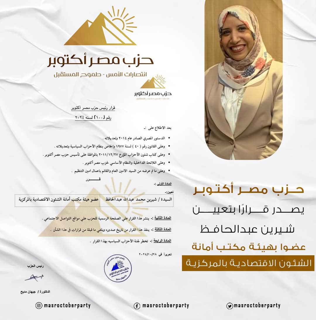 أصدرت الدكتورة جيهان مديح، رئيس حزب مصر أكتوبر، قرار رقم 100 لسنة 2024 ، بتعيين السيدة شيرين محمد عبدالحافظ، عضوا بهيئة مكتب أمانة الشئون الاقتصادية بالمركزية، وذلك بعد الاطلاع على الدستور المصري الصادر عام 2014 وتعديلاته، وعلى القانون رقم 40 لسنة 1977 والخاص بنظام الأحزاب السياسية وتعديلاته.