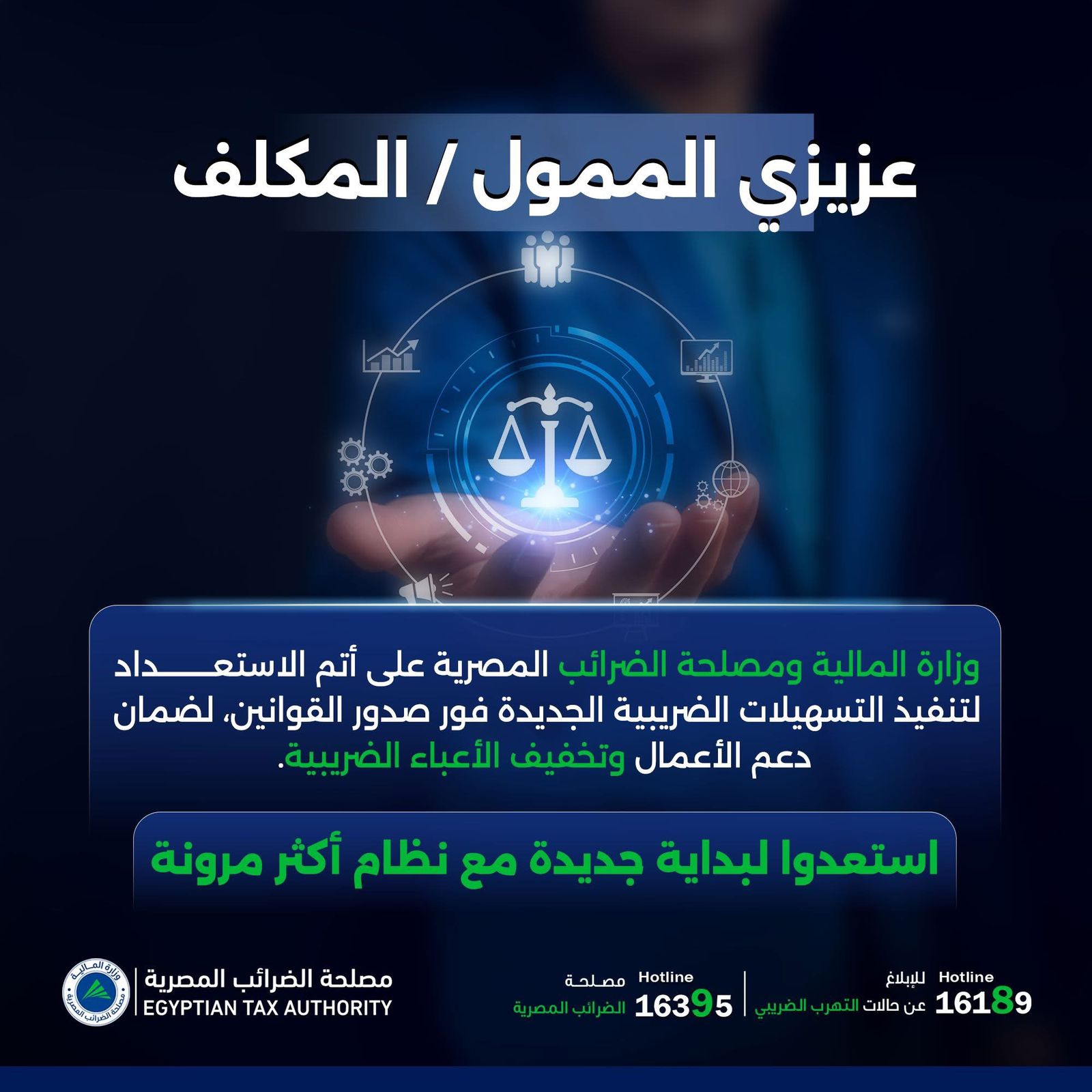 أكدت مصلحة الضرائب المصرية جاهزيتها لتنفيذ التسهيلات الضريبية الجديدة فور صدور القوانين المنظمة لها، وذلك في إطار جهود وزارة المالية لتخفيف الأعباء الضريبية على الممولين، وتحفيز بيئة الأعمال في مختلف القطاعات، بما في ذلك التجارة الإلكترونية وصناعة المحتوى.