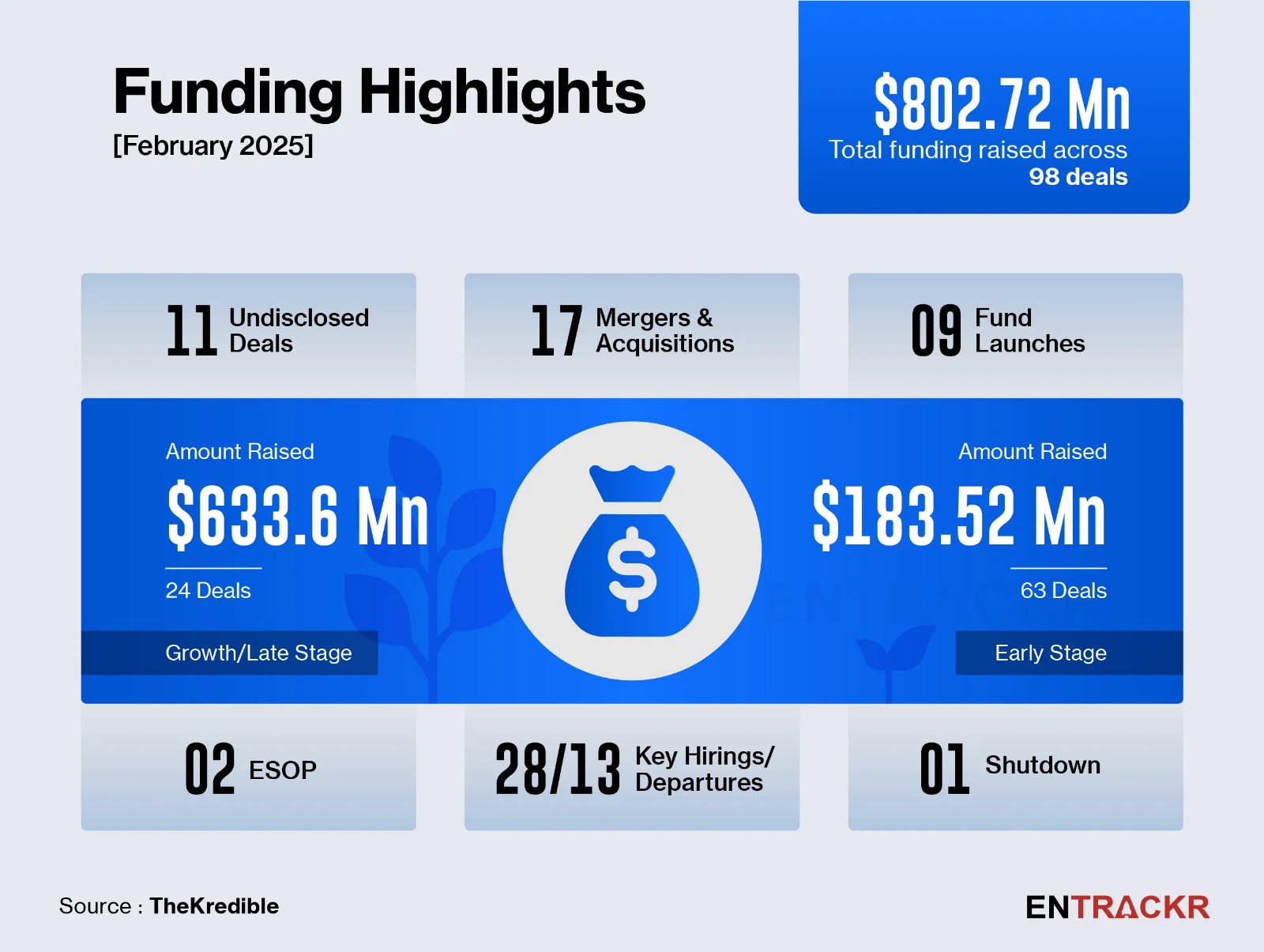 شهدت الشركات الناشئة في الهند انخفاضًا حادًا في تدفقات رأس المال الاستثماري خلال فبراير 2025، حيث تراجع إجمالي التمويل إلى 802 مليون دولار عبر 98 صفقة، مقارنة بـ 1.76 مليار دولار في يناير، ما يمثل انخفاضًا بنسبة 54% على أساس شهري، وفقًا لبيانات «TheKredible».