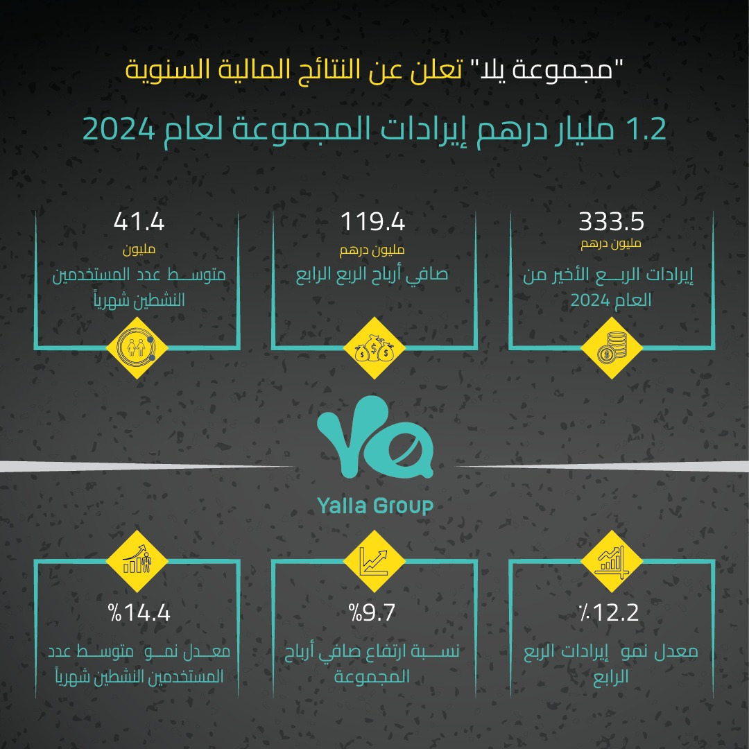 ووفقاً للبيانات المالية التي أعلنتها المجموعة، واصلت يلا تركيزها على دعم مسيرة نموها حيث تخطت إيرادات الشركة خلال العام الماضي 2024 حاجز المليار درهم لتبلغ 1.2مليار درهم (339.7 مليون دولار) بنسبة نمو بلغت 6.5% مقارنة بــــ 1.1مليار درهم عام 2023.