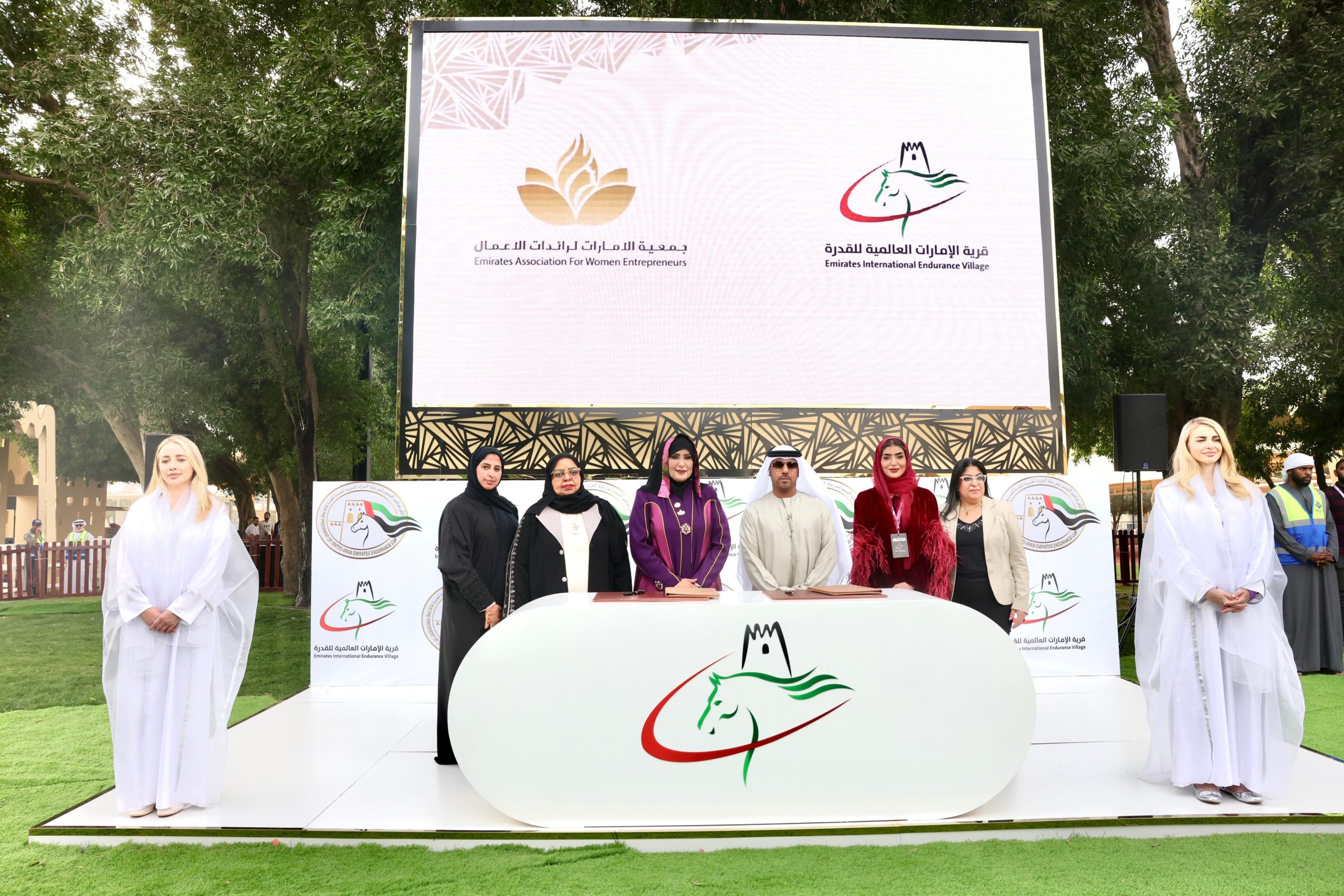 قام بالتوقيع على مذكرة التفاهم كل من الدكتورة شفيقة العامري رئيس مجلس إدارة جمعية الإمارات لرائدات الأعمال وسعادة مسلم سالم العامري مدير عام قرية الإمارات العالمية للقدرة.