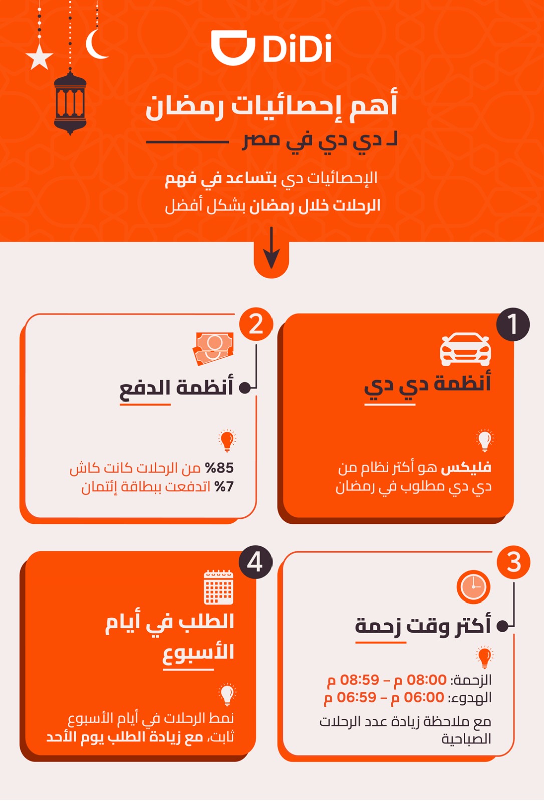 وعبر تحليل أنماط النقل وأوقات الذروة وخيارات الركاب المختلفة بشهر رمضان الماضي 2024، تسعى دي دي مصر إلى تحسين تجربة النقل لمستخدميها خلال رمضان 2025، مما يجعل تحركاتهم أكثر راحة وسلاسة.