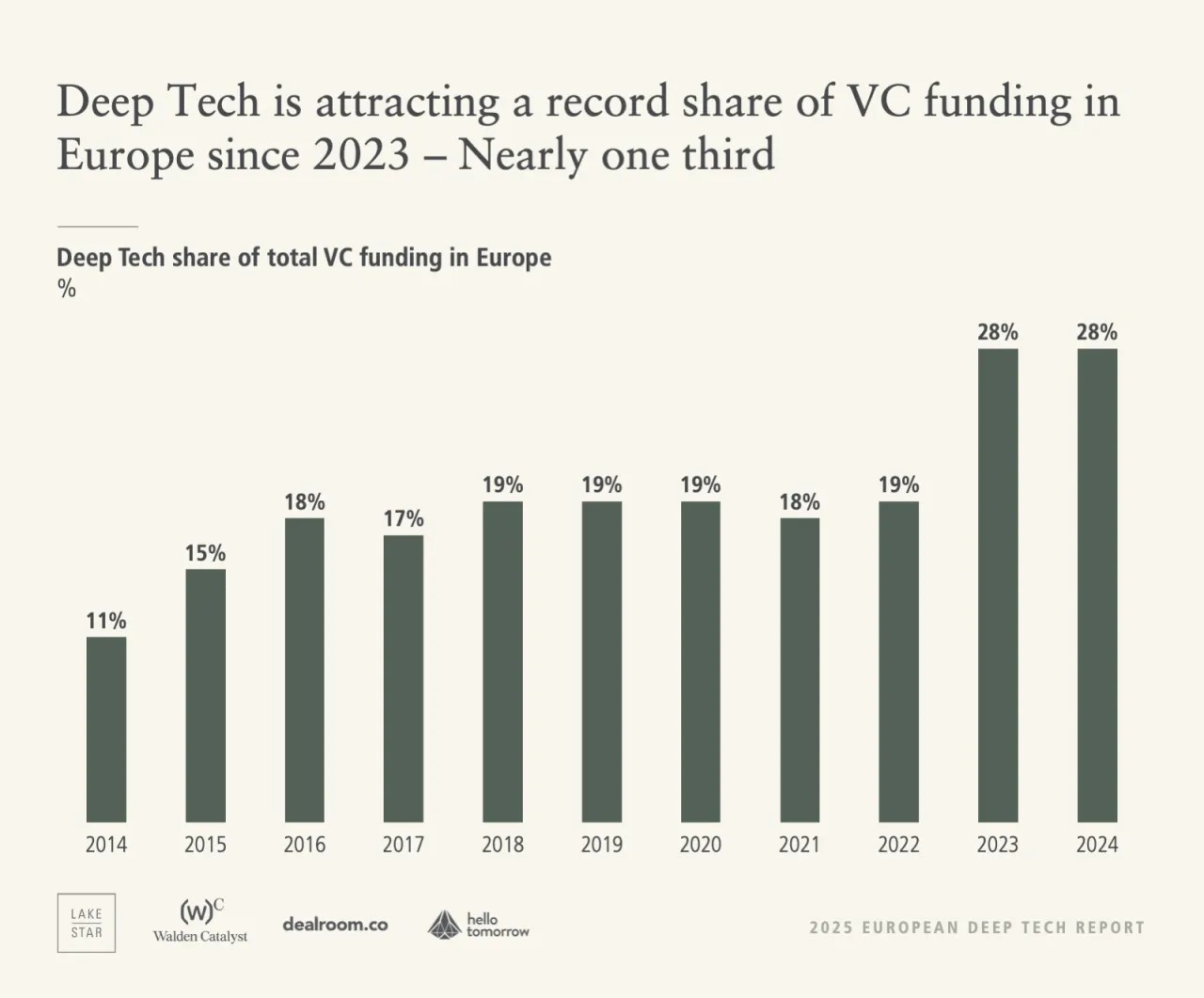 وأوضح التقرير، الذي جاء في 184 صفحة، أن ما يقرب من ثلث إجمالي الاستثمارات في رأس المال المغامر بأوروبا يُوجه حاليًا إلى قطاع «Deep Tech»، في إشارة إلى تنامي الاهتمام بهذا المجال الواعد.