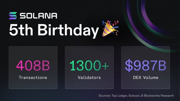 أعلنت سولانا عبر حسابها الرسمي على منصة “X” (تويتر سابقًا): “عيد ميلاد سعيد لعائلة سولانا! أكثر من 408 مليارات معاملة، وأكثر من 1,300 مدقق، وحجم تداول يفوق 987 مليار دولار. شكرًا لكل المؤسسين والمطورين والمسوقين حول العالم الذين جعلوا سولانا ما هي عليه اليوم — خمس سنوات وما زلنا في البداية!”