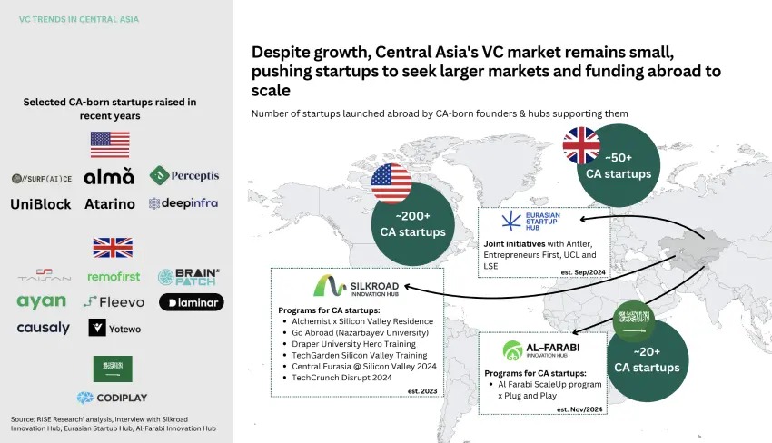 كشفت دراسة حديثة أجرتها «RISE Research» بالتعاون مع «EA Group» و«MA7 Ventures» و«BGlobal Ventures» (إحدى الشركات التابعة لـ«Qazaqstan Investment Corporation») وشركة «KPMG» ومنصة «dealroom.co» أن حجم الاستثمارات في رأس المال المغامر في آسيا الوسطى بلغ 96 مليون دولار في عام 2024، مسجلًا نموًا بنسبة 7% مقارنة بعام 2023. وأشارت الدراسة إلى أن محدودية الأسواق المحلية تدفع الشركات الناشئة في المنطقة إلى التوسع دوليًا عبر نماذج توسع عالمية.