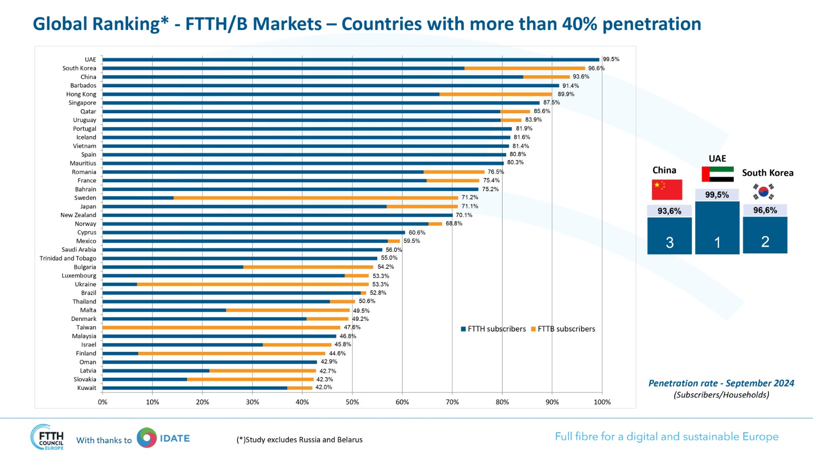 وبحسب البيانات التي نشرها التقرير، تصدَّرَت دولة الإمارات العربية المتحدة المرتبةَ الأولى عالميًّا في نسبة الألياف الضوئية الموصولة للمنازل، محقِّقَة رقمًا قياسيًّا للمرة الأولى عالميًّا بنسبة 99.5%، متفوِّقةً على كوريا الجنوبية؛ التي حلت في المركز الثاني بنسبة 96.6%، تليها الصين في المركز الثالث بنسبة 93.6%، في حين حلت هونغ كونغ في المركز الخامس بنسبة 89.9%.