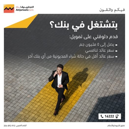 يقدم « التجاري وفا بنك إيجيبت » قرض تمويل شخصي لموظفي البنوك، حيث يمكنهم الحصول على تمويل يصل إلى 5 مليون جنيه مصري، بفترة سداد تصل إلى 10 سنوات وبسعر عائد تنافسي.