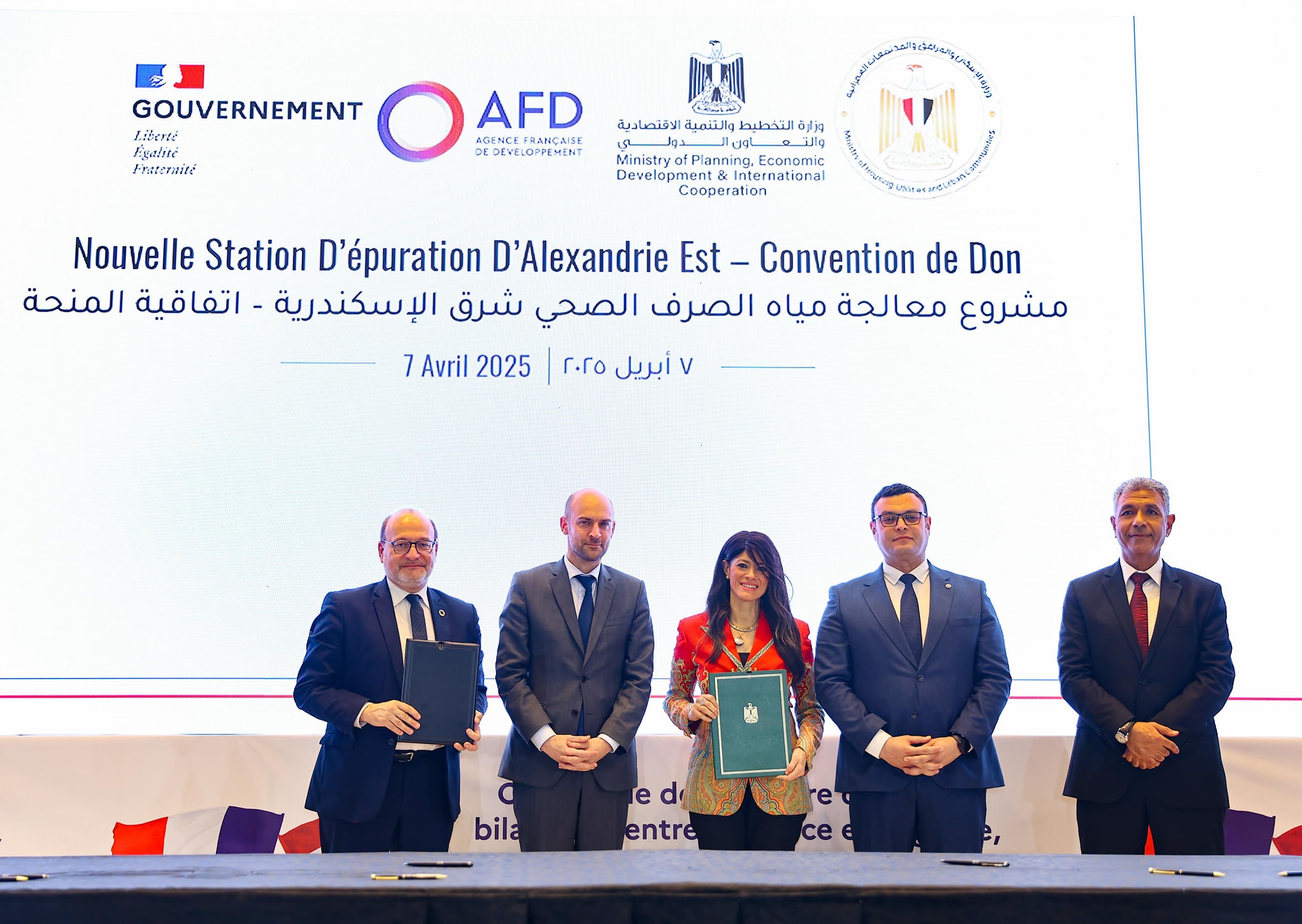 وفي سياق آخر تم توقيع اتفاق تمويل ومنحة لمشروع “محطة معالجة مياه الصرف الصحي الجديدة بشرق الإسكندرية”، بواقع تمويل من الوكالة الفرنسية للتنمية بقيمة 68 مليون يورو ومنحة بقيمة 2 مليون يورو لصالح وزارة الاسكان والمرافق والمجتمعات العمرانية.