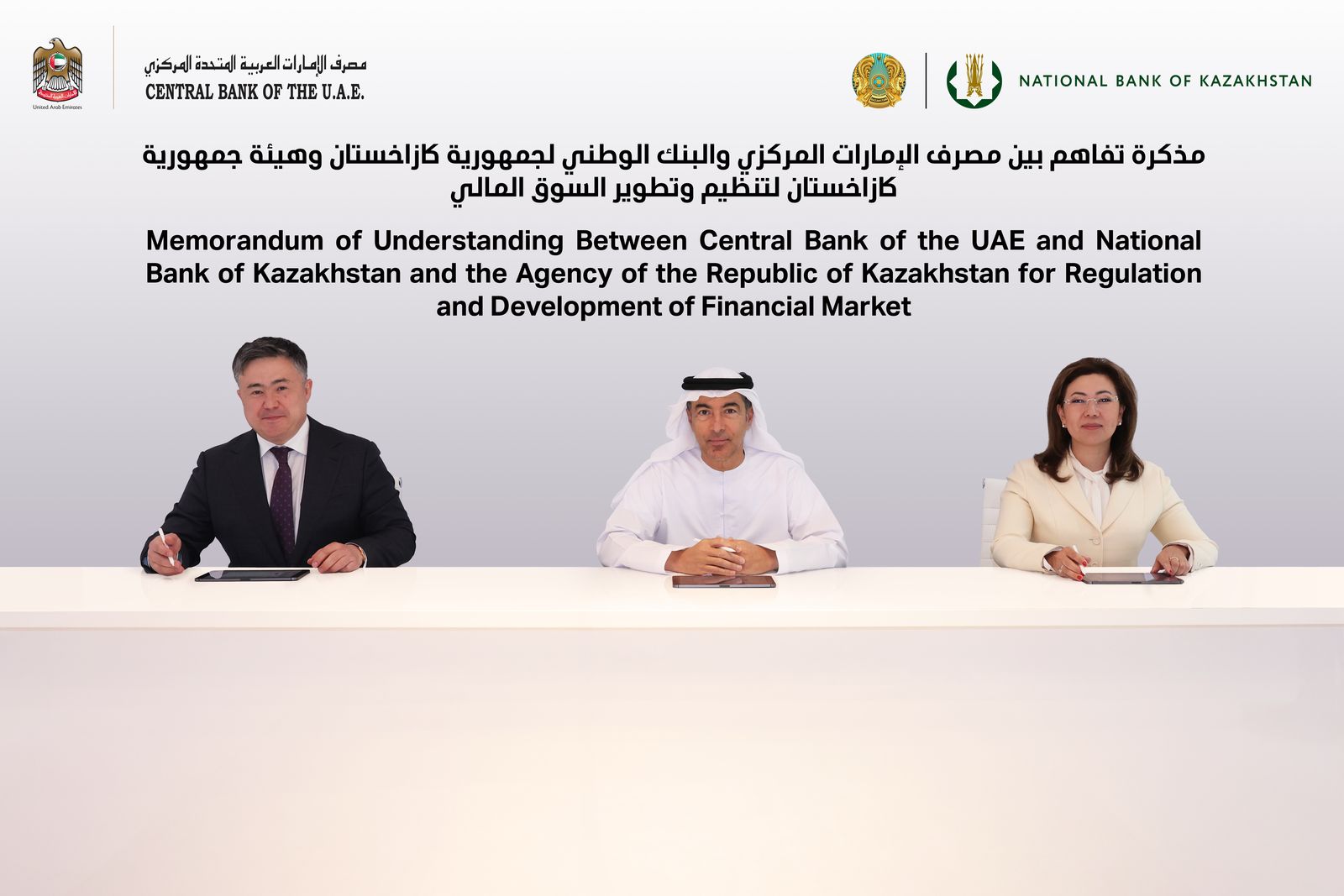 وقّع معالي خالد محمد بالعمى، محافظ مصرف الإمارات العربية المتحدة المركزي، ومعالي تيمــــور سيولمينوف محافظ البنك الوطني لكازاخستان، ومعالي مدينا ابيلكاسيموفا، رئيس هيئة كازاخستان لتنظيم وتطوير السوق المالي، مذكرة تفاهم تهدف إلى تعزيز التعاون وإرساء إطار لتوطيد العلاقات وتبادل المعلومات والخبرات في المجالات المشتركة.