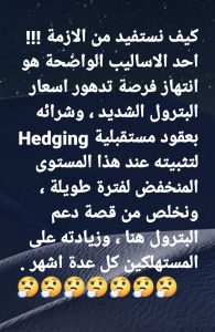 وقال عبر صفحتة على مواقع التواصل الاجتماعي فيسبوك لابد من اغتنام فرصة تدهور أسعار البترول عالميا وشرائه بعقود مستقبلية (Hedging) لتثبيت الأسعار المنخفضة لفترة طويلة.