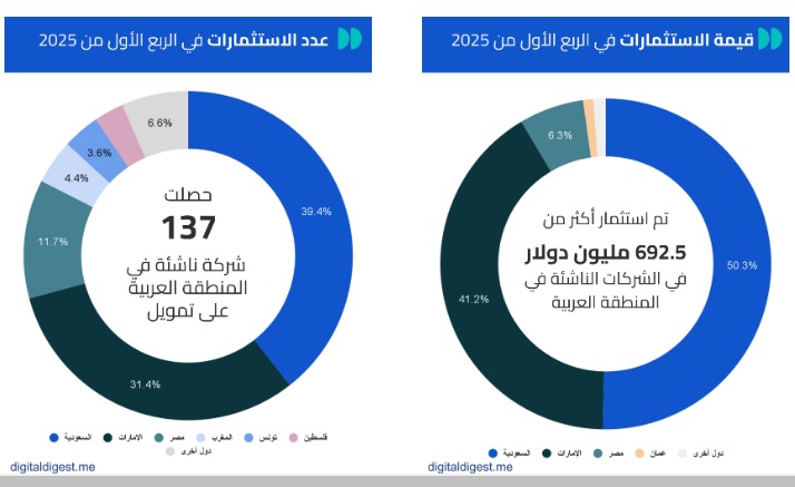 سجلت بيئة ريادة الأعمال في الشرق الأوسط وشمال أفريقيا أداءً استثنائياً خلال الربع الأول من عام 2025، حيث تجاوز إجمالي الاستثمارات المعلنة في الشركات الناشئة حاجز الـ 692.5 مليون دولار، محققاً نمواً بنسبة 60% مقارنة بالفترة نفسها من العام 2024، ما يعكس ثقة متزايدة من المستثمرين في قدرات الشركات الناشئة بالمنطقة على التوسع والابتكار.