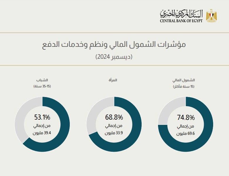 وأظهر التقرير أن نسبة الشمول المالي للمواطنين الذين تبلغ أعمارهم 15 عامًا فأكثر وصلت إلى 74.8% من إجمالي عدد السكان البالغ 69.6 مليون نسمة، مما يعكس اتساع نطاق الاعتماد على الحسابات البنكية، المحافظ الإلكترونية، وبطاقات الدفع المسبق.