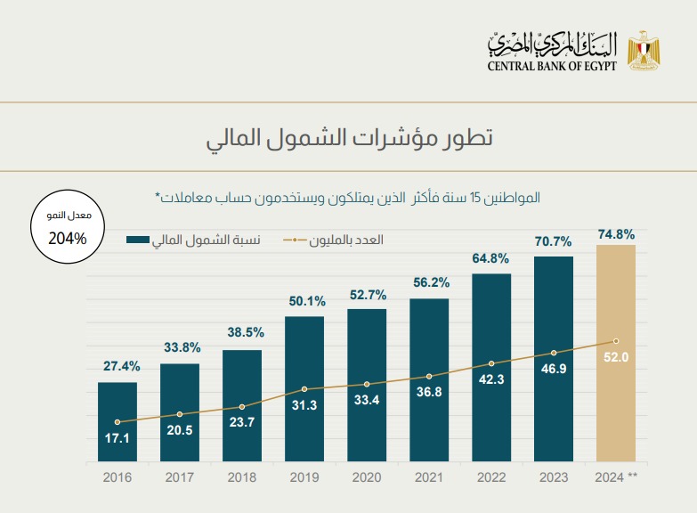 أعلن «البنك المركزي المصري» (Central Bank of Egypt) عن قفزة تاريخية في مؤشرات الشمول المالي، حيث سجل عدد المواطنين المصريين من عمر 15 عامًا فأكثر الذين يمتلكون ويستخدمون حسابات معاملات ارتفاعًا ملحوظًا بنسبة نمو بلغت نحو 204% خلال الفترة من عام 2016 وحتى نهاية عام 2024.