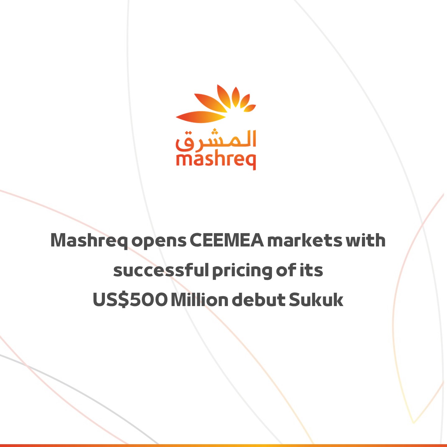 أعلن المشرق، إحدى المؤسسات المالية الرائدة في منطقة الشرق الأوسط وشمال أفريقيا، والحاصل على تصنيفات ائتمانية A3 من وكالة موديز وA من وكالتي ستاندرد آند بورز وفيتش (جميعها بتوقعات مستقرة)، عن نجاحه في تسعير أول إصدار صكوك له بقيمة 500 مليون دولار لمدة خمس سنوات، بمعدل ربح سنوي ثابت يبلغ 5.03%.