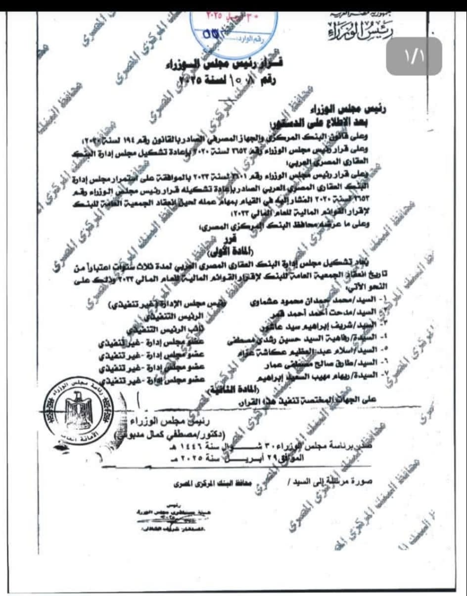 أصدر الدكتور مصطفى مدبولي رئيس الحكومة المصرية قرارا بإعادة تشكيل مجلس إدارة البنك العقاري المصري العربي، لمدة 3 سنوات، برئاسة «محمد حمدان عشماوي» رئيسا لمجلس الإدارة (غير تنفيذي)، و «مدحت قمر» رئيسا تنفيذيا، وتضمن القرار تعيين نائبا واحدا للرئيس التنفيذي هو «شريف إبراهيم سيد عاشور».