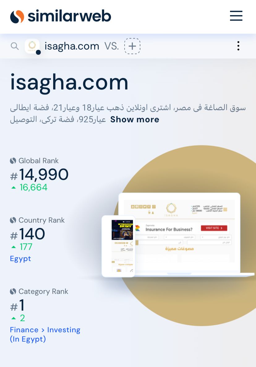 في إنجاز غير مسبوق، حصل موقع isagha.com رسميًا على المركز الأول في مصر ضمن فئة التمويل والاستثمار (Finance > Investing)، وذلك وفقًا لآخر تصنيف صادر عن منصة SimilarWeb العالمية المتخصصة في تحليل حركة المواقع الإلكترونية.