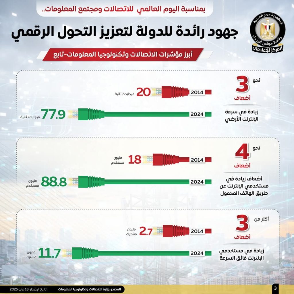 وفي مؤشر الأمن السيبراني العالمي، حصلت «مصر» على 100 نقطة عام 2024، لتصبح ضمن أفضل 12 دولة أداءً على مستوى العالم، كما احتلت المركز الأول إفريقيًا في سرعة الإنترنت الثابت، والـ 6 في سرعة تحميل الإنترنت عبر الهاتف المحمول في إبريل 2025.