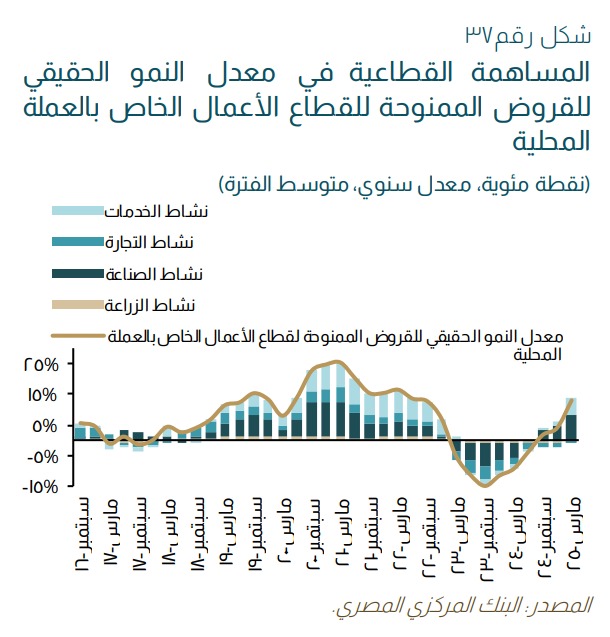 وبدأ معدل النمو الحقيقي للقروض الممنوحة للقطاع الخاص بالعملة المحلية في التوسع خلال الربع الثالث من عام 2024، ليصل إلى 10.1% في المتوسط خلال الربع الأول من عام 2025، مقارنة بمتوسط بلغ سالب 8.7% خلال الربع الأول من عام 2024.