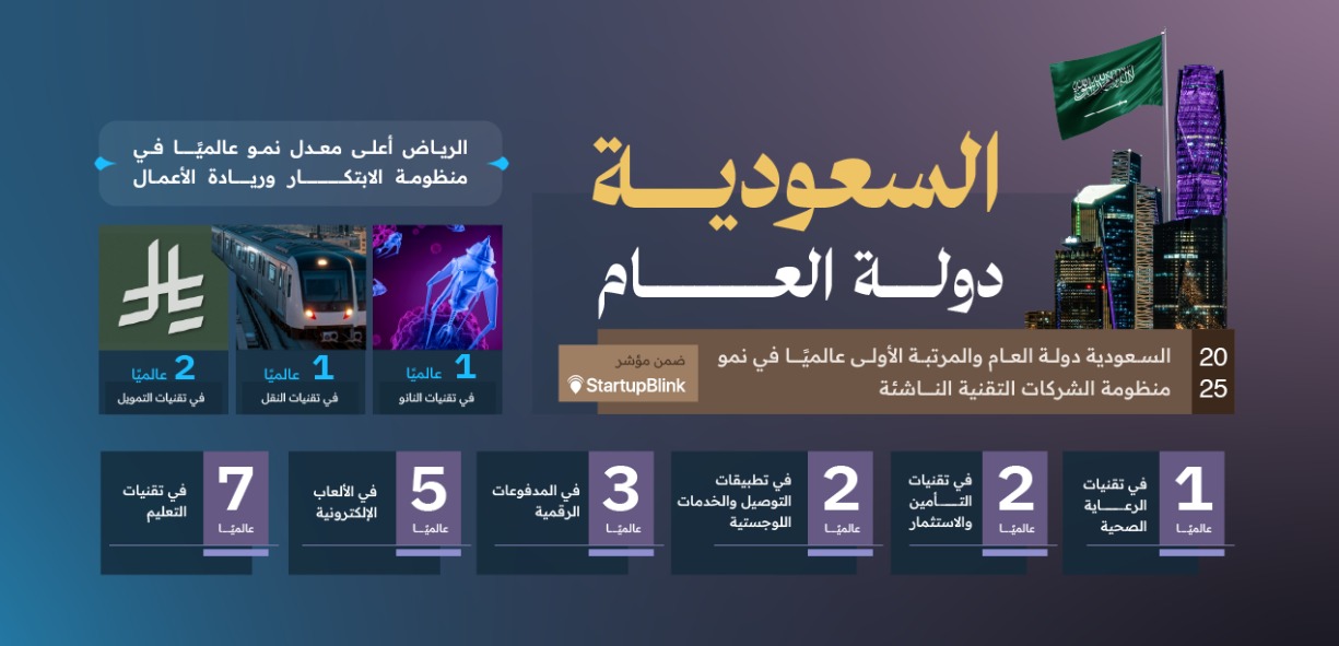كشف تقرير StartupBlink العالمي عن تحقيق المملكة العربية السعودية إنجازًا جديدًا بتصدرها المرتبة الأولى عالميًّا في نمو منظومة الابتكار وريادة الأعمال، واختيارها “دولة العام 2025”.