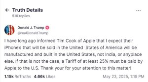 وفي منشور ناري عبر منصة Truth Social، قال ترامب: “لقد أخبرت منذ وقت طويل تيم كوك، الرئيس التنفيذي لشركة Apple، أنني أتوقع أن يتم تصنيع أجهزة الآيفون التي تُباع في الولايات المتحدة داخل أمريكا وليس في الهند أو أي مكان آخر. وإن لم يحدث ذلك، فعلى Apple أن تدفع رسوماً جمركية لا تقل عن 25%.”