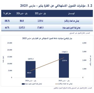 ارتفعت قيمة التمويلات الممنوحة من شركات التمويل الاستهلاكي خلال الربع الأول من العام الحالي لتبلغ 17.465 مليار جنيه مقابل 12.07 مليار جنيه خلال نفس الفترة من 2024 بارتفاع بلغت نسبته 44%.