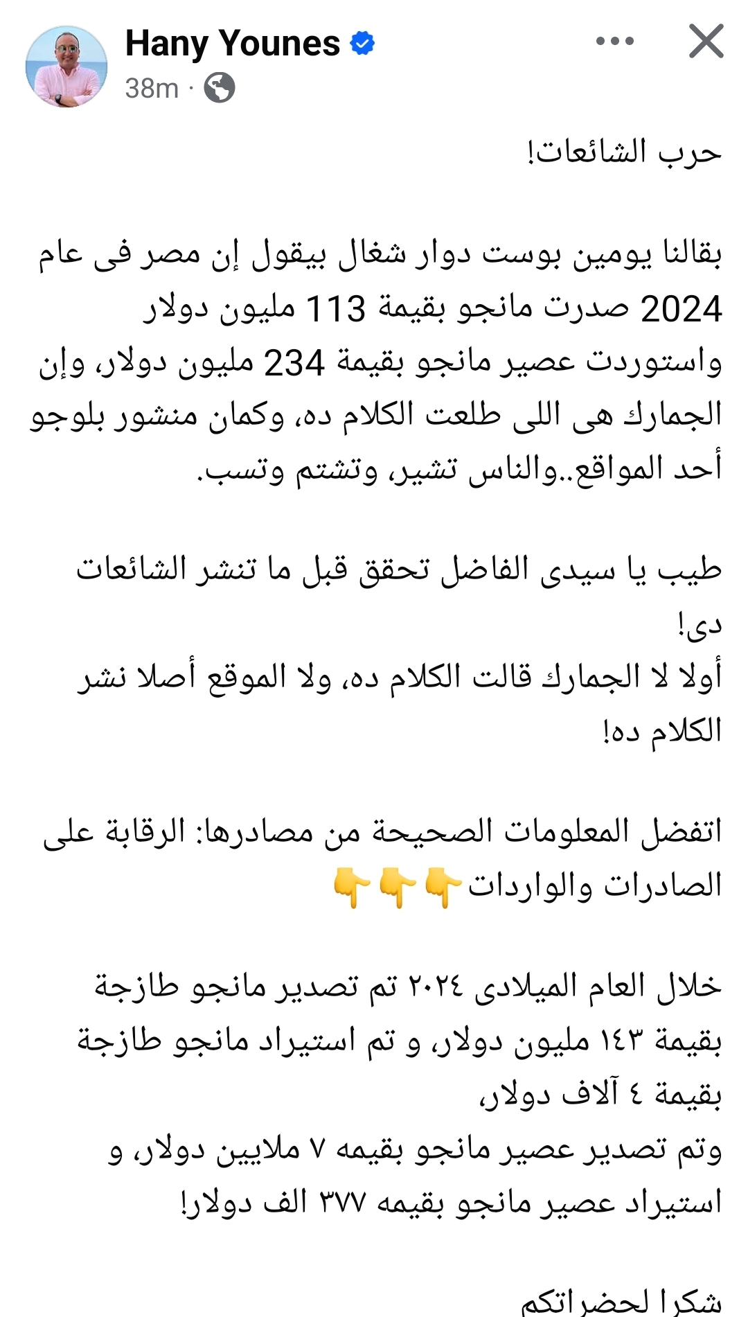 حرب الشائعات!..بقالنا يومين بوست دوار شغال بيقول إن مصر فى عام 2024 صدرت مانجو بقيمة 113 مليون دولار واستوردت عصير مانجو بقيمة 234 مليون دولار، وإن الجمارك هى اللى طلعت الكلام ده، وكمان منشور بلوجو أحد المواقع..والناس تشير، وتشتم وتسب.