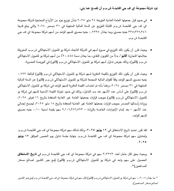 وقد تحدد 12 يونيو 2025 كتاريخ استحقاق للمساهمين، سواء كانوا مالكين أو مشترين لسهم «مجموعة إي اف جي القابضة ش.م.م» حتى نهاية جلسة تداول ذلك اليوم.