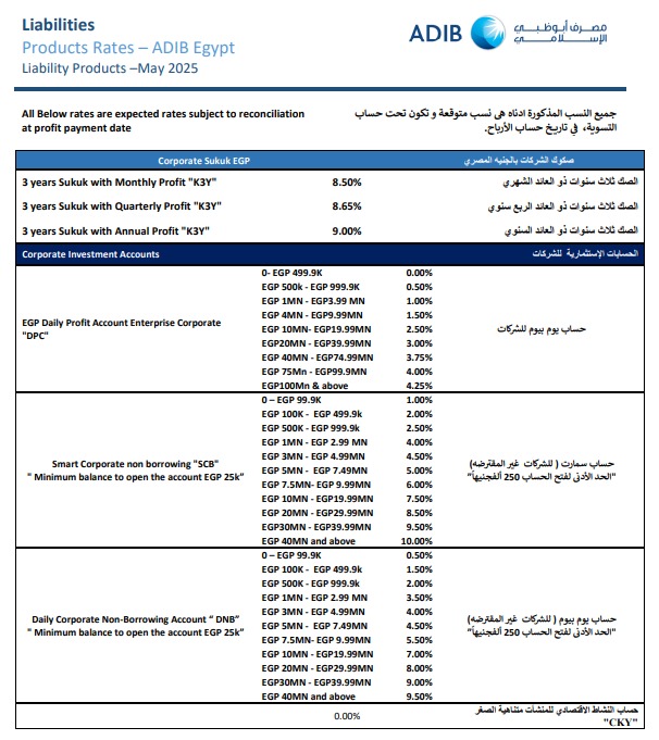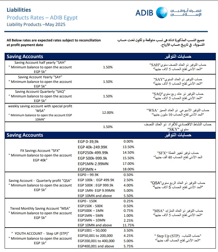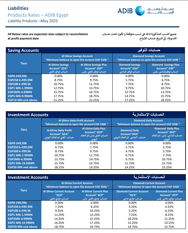 أعلن مصرف أبو ظبي الإسلامي – مصر عن تحديث جديد لهيكل أسعار العوائد المتوقعة على منتجات الأوعية الادخارية، وذلك في إطار مراجعة دورية تهدف إلى مواءمة العائدات مع تطورات السوق المصرفية والاتجاهات الاقتصادية الحالية.