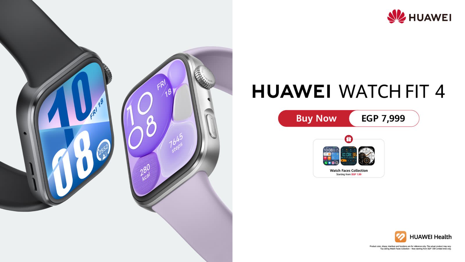 أما ساعة HUAWEI WATCH FIT 4 فتبدأ من 7,999 جنيهًا مصريًا، مع واجهات الساعة ابتداءً من 1.99 جنيهًا مصريًا.