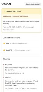 أوضحت التحديثات المتتالية من الشركة أن 14 مكونًا من مكونات **APIs** و 21 مكونًا من **ChatGPT** تأثرت بالانقطاع. وتتوالى إعلانات الشركة عن التقدم المحرز في عملية الاستعادة منذ الساعة 4:43 مساءً، مؤكدة أنها “تراقب الاستعادة المستمرة عبر API و ChatGPT”.