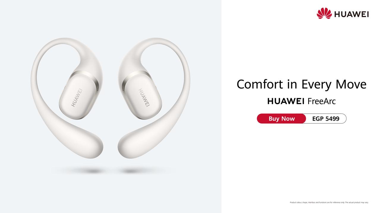تتميز HUAWEI FreeArc بتصميم C-bridge الأيقوني مع شكل جديد لخطافات الأذن. يجمع بين الهندسة المتطورة والتصميم المريح ليقدم تجربة صوتية مفتوحة لا مثيل لها، مع صوت قوي وجهير نابض وراحة مثالية في جميع الظروف. تتوفر HUAWEI FreeArc الجديدة عبر الموقع الرسمي لشركة هواوي ومجموعة من المتاجر المختارة بسعر 5499 جنيهًا مصريًا.