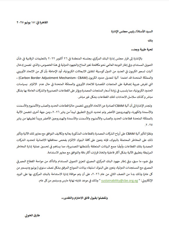 ونظرًا للتأثير المحتمل لآلية CBAM على أرباح الشركات المصدّرة في القطاعات المذكورة أعلاه، وتكاليف التوافق مع معايير تلك الآلية، وتأثير ذلك على المخاطر المحتملة بالبنوك، فإنه على كافة البنوك القيام بتحليل محافظها الائتمانية لتحديد الشركات المصدّرة ضمن تلك القطاعات، وجمع البيانات المتعلقة بأنشطتها التصديرية، مما يساهم في تحسين فاعلية إدارة المخاطر واتخاذ قرارات أدق والتوافق مع معايير الاستدامة.