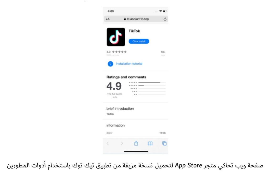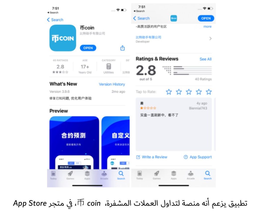 تنكر البرنامج في متجر App Store على هيئة تطبيق للعملات المشفرة – coin 币. ونُشر البرنامج الخبيث عبر مواقع تصيد احتيالي تحاكي متجر App Store الرسمي الخاص بالايفون ، متخفياً في صورة تطبيقات مثل تيك توك وتطبيقات المراهنات.